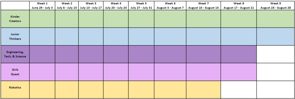 The camps running during each week of summer 2026 are shown below. Kinder Creators and Junior Thinkers will run each week from June 29-August 28. Girls' Quest and Engineering, Tech, & Science will run from June 29-August 21. Robotics will run from June 30-August 15.